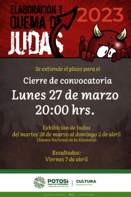 El cierre de convocatoria será el próximo lunes 27 de marzo, exhibición de Judas del martes 28 de marzo al domingo 2 de abril en el Museo Nacional de la Máscara. Los resultados se darán a conocer el viernes 7 de abril de 2023 en el sitio web https://slp.gob.mx/secult/ y en la página oficial de Facebook Secretaría de Cultura de San Luis Potosí. Se entregarán los siguientes premios en cada una de las 2 categorías: Primer lugar: $12,000.00; Segundo lugar: $9,000.00; Tercer lugar: $7,000.00 La premiación: Se llevará a cabo el sábado 8 de abril del año en curso en la explanada del Museo Nacional de la Máscara 18:00 horas y la quema de los Judas en la explanada del Templo de Nuestra Señora del Carmen a las 19:00 horas.