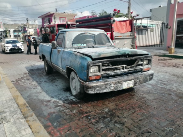 Esta mañana se registró un incendio en una camioneta marca Dodge color azul, de modelo atrasado, sobre la avenida Hidalgo entre las calles Carranza y Galeana en la zona centro.