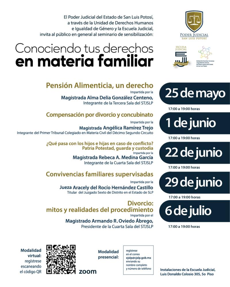 El 1 de junio se abordará la compensación por divorcio y concubinato, el 22 de junio, patria potestad, guarda y custodia; el 29 de junio convivencias familiares supervisadas y el día 6 de julio, mitos y realidades del procedimiento de divorcio.