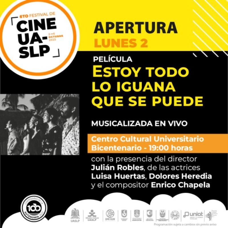 El arranque del 6to Festival de Cine UASLP, será con la proyección de la película "Estoy todo lo Iguana que se puede", este lunes 02 de octubre en el teatro del Centro Cultural Universitario Bicentenario (CC200). La cita es a las 19:00 horas con entrada libre.