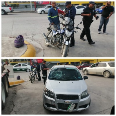 Esta mañana se registró un choque entre un vehículo Chevrolet Aveo color gris y una motocicleta Italika color azul, en el cruce de Bulevar México Laredo y la avenida Fray Andrés de Olmos.