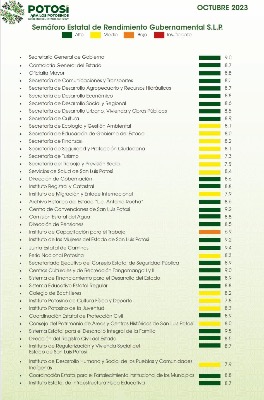 El Gobernador de San Luis Potosí Ricardo Gallardo Cardona, anunció los resultados del Semáforo de Rendimiento Gubernamental correspondiente al mes de octubre, que revelan un sólido desempeño de las y los funcionarios gubernamentales en apoyo a la ciudadanía, con el 64.2 por ciento de las dependencias estatales con calificación alta, solo una evaluación baja y sin que se hayan presentado registros insuficientes.