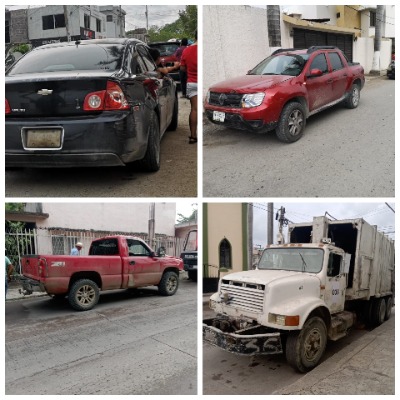 En un segundo incidente, un camión recolector de basura impactó el espejo lateral de una camioneta Chevrolet roja en la intersección de las calles Escontría y Madero, ubicada en la zona central de la ciudad.