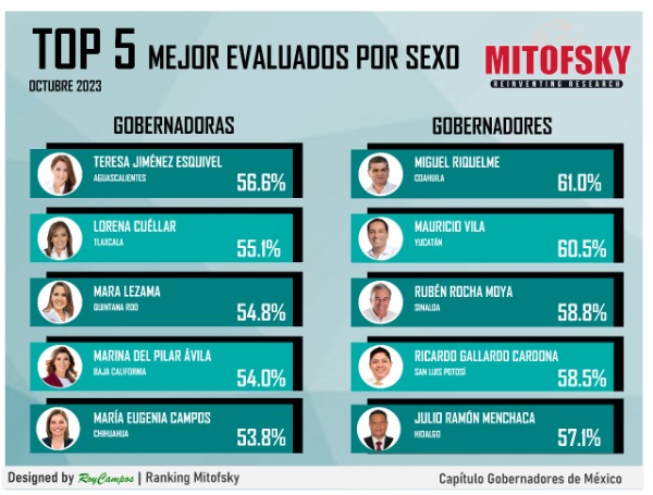 En la categoría de aprobación por género, las mujeres han destacado su respaldo hacia diversos líderes estatales. Teresa Jiménez de Aguascalientes encabeza la lista, seguida por Lorena Cuellar de Tlaxcala, Laura Beristain Lezama de Quintana Roo, Marina del Pilar Ávila de Baja California, y María Eugenia Campos de Chihuahua.