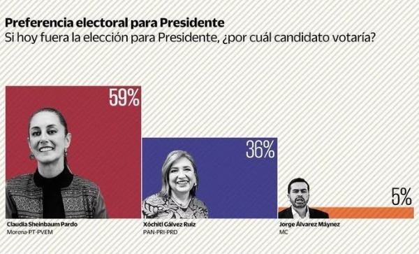 Los resultados muestran que hasta el momento la intención de voto efectiva se inclina 59% a Sheinbaum Pardo, quien representa a la coalición Morena-PVEM-PT, mientras Gálvez, de la alianza PAN-PRI-PRD, obtiene 36%. Por su lado, Jorge Álvarez Máynez, de Movimiento Ciudadano (MC), registra 5%.