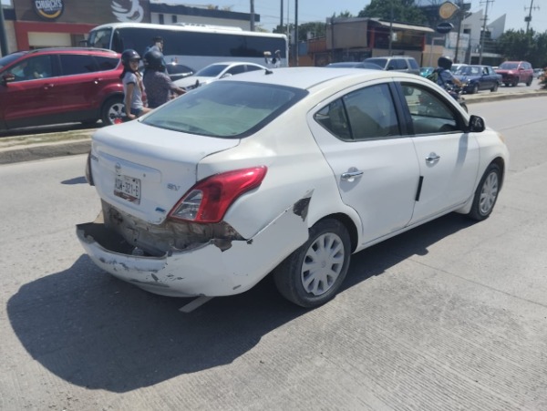 Esta tarde, se registró un choque por alcance entre un Nissan Versa y un taxi del sitio Infonavit 2, marcado con el número 557, en el Boulevard México - Laredo, a la altura del cruce con el Boulevard Lázaro Cárdenas.