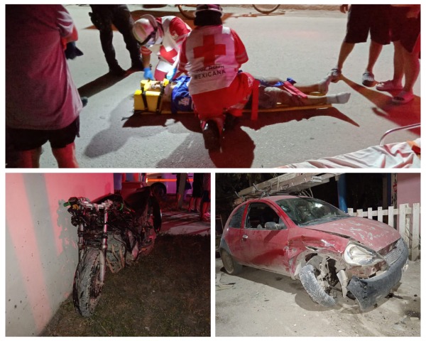 Esta noche se registró un aparatoso accidente, en donde un hombre joven resultó lesionado de gravedad, al chocar su motocicleta deportiva, contra un vehículo estacionado marca Ford ka rojo.