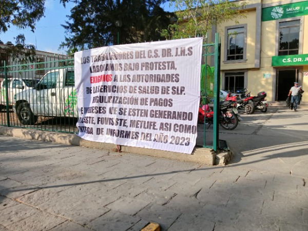 Los trabajadores del Centro de Salud "Juan H. Sánchez" laboran bajo protesta debido a que exigen a las autoridades de los servicios de salud de San Luis Potosí la regularización de pagos e intereses que se estén generando al ISSSTE, FOVISSSTE, Metlife, así como también la entrega de uniformes del año 2023.