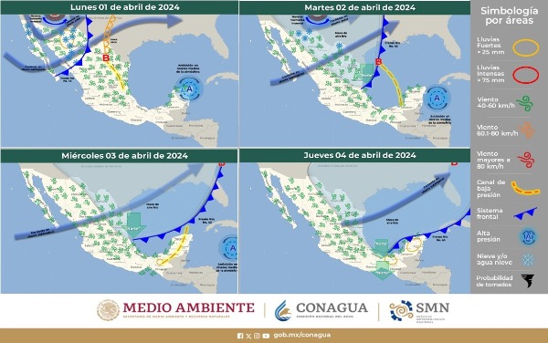 Finalmente, una circulación anticiclónica en niveles medios de la atmósfera mantendrá baja probabilidad de lluvia y ambiente caluroso a muy caluroso sobre la mayor parte del territorio nacional, con temperaturas superiores a 40 °C en zonas de Nuevo León, Tamaulipas, San Luis Potosí, Nayarit, Jalisco, Colima, Michoacán, Guerrero, Morelos (sur), Veracruz, Oaxaca, Chiapas, Tabasco, Campeche y Yucatán.