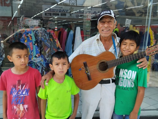 En el centro de Ciudad Valles, el ciudadano Benecio N ha decidido compartir el mensaje de Dios a través de la música durante Semana Santa, en compañía de sus nietos.
