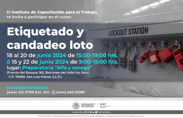 Como parte de la amplia oferta de profesionalización para que las y los potosinos accedan a empleos mejor pagados y formen parte del desarrollo económico que impulsa el Poder Ejecutivo del Estado, el Instituto de Capacitación para el Trabajo (Icat), invita a participar en el curso "Etiquetado y candadeo LOTO" para el bloqueo y señalización de equipo industrial en trabajos de mantenimiento o reparación.