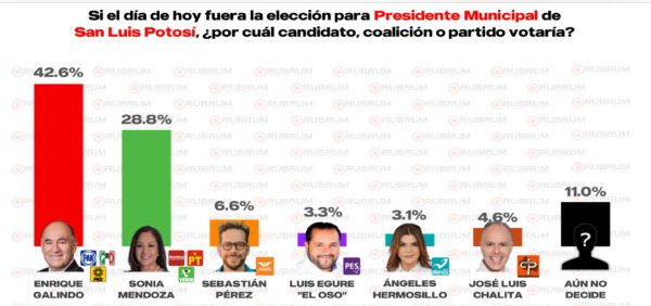 A pocos días de la elección para la presidencia municipal de San Luis Potosí, la tendencia favorable al candidato Enrique Galindo Ceballos parece irreversible, de acuerdo con la encuestadora Rubrum, que lo coloca con una ventaja de 13.8 por ciento sobre el segundo lugar.