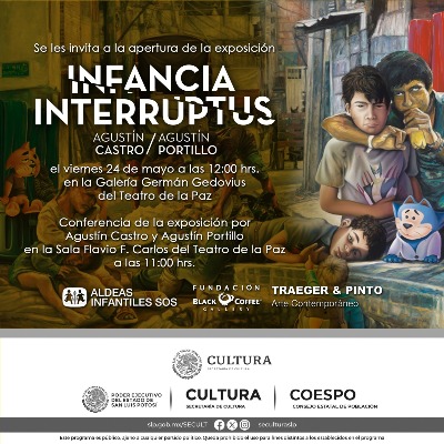 El Poder Ejecutivo del Estado de San Luis Potosí, a través de la Secretaría de Cultura, invita al público en general a la inauguración de la exposición de pintura y escultura "Infancia Interruptus" que se llevará a cabo el jueves 24 de mayo a las 12:00 h, en la Galería German Gedovius del Teatro de la Paz. Entrada libre.