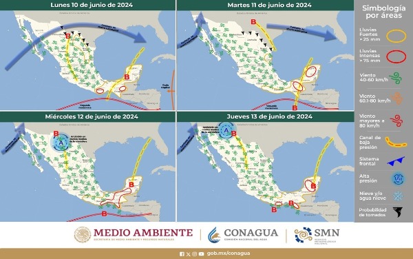 Finalmente, la Conagua y el Servicio Meteorológico Nacional exhortan a la población a mantenerse informada sobre las condiciones meteorológicas mediante las páginas de internet www.gob.mx/conagua y http://smn.conagua.gob.mx, en las cuentas de X @conagua_mx y @conagua_clima y de Facebook www.facebook.com/conaguamx, así como en la aplicación para dispositivos móviles ConaguaClima, donde se puede consultar el pronóstico por municipios.