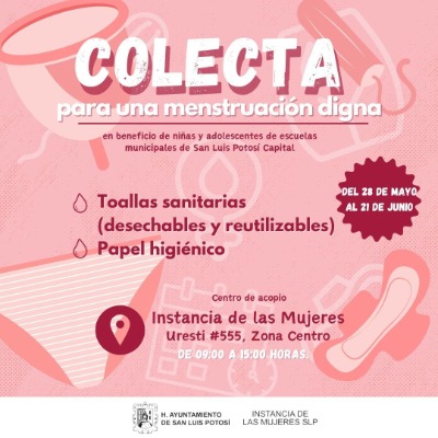 El Gobierno Municipal de San Luis Capital, a través de la Instancia de las Mujeres, mantiene el desarrollo de la campaña "Colecta para una Menstruación Digna", con el fin de reunir productos de higiene como toallas sanitarias en las presentaciones desechable y reutilizable, y papel higiénico, para distribuirlo entre niñas y jovencitas que pertenecen al sistema escolarizado del Ayuntamiento.