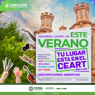 El Gobierno del estado de San Luis Potosí, a través de la Secretaría de Cultura, invita a participar en este Verano 2024 en los cursos y talleres que ofrece el Centro de las Artes de San Luis Potosí, que cuenta con una amplia oferta educativa, las inscripciones ya se encuentran abiertas en formación inicial, actualización y especialización profesional en las disciplinas de artes escénicas, música, artes visuales, integración y literatura y arte y tecnología