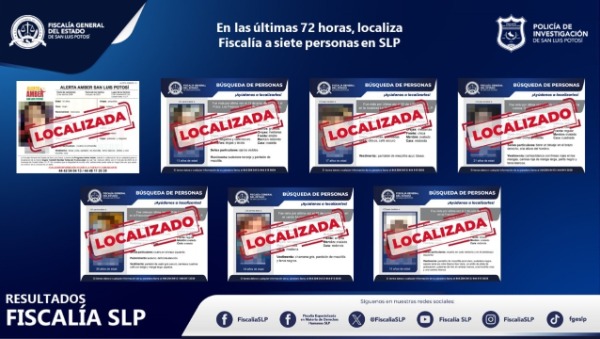 La Fiscalía General del Estado de San Luis Potosí (FGESLP) informó que, en las últimas 72 horas han sido localizadas siete personas que contaban con una ficha de búsqueda en la entidad potosina.
