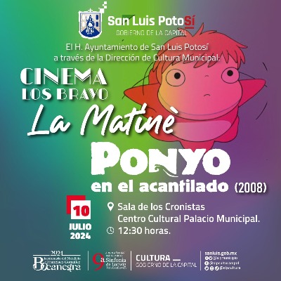 El Gobierno de la Capital del Sí, a través de la Dirección de Cultura, informa a las y los potosinos, así como visitantes en la Capital, que este miércoles 10 de julio se proyectará la aclamada película "Ponyo en el acantilado" (2008), del renombrado director japonés Hayao Miyazaki, como parte de La Matiné de Cinema Los Bravo.