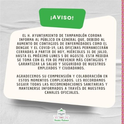 El Ayuntamiento de Tampamolón Corona anunció su cierre temporal a partir de hoy, 31 de julio, debido al reciente aumento en los contagios de enfermedades como el dengue y el COVID-19 en la región. La suspensión de actividades se extenderá hasta el próximo lunes, 5 de agosto.