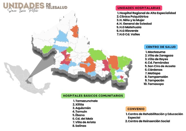 La titular de la dependencia, Ymuri Mercedes Vaca Ávila, dijo que actualmente la red de Telemedicina en San Luis Potosí está integrada por 25 Unidades Médicas distribuidas estratégicamente en distintos municipios de las siete jurisdicciones sanitarias, acorde a la estrategia de atención social que instruyó el Gobernador Ricardo Gallardo Cardona.