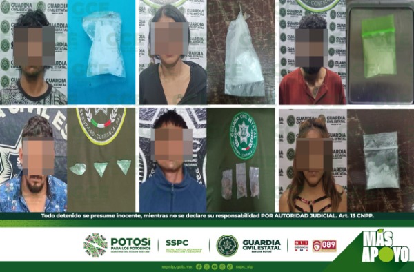 Gerardo "N" de 40 años de edad, fue detenido en la colonia Arboledas del Real, luego de asegurarle una dosis de "cristal"; Javier "N" de 27 años, quedó detenido en la colonia General I. Martínez, con una dosis de "cristal"; Juan "N" de 55 años, fue asegurado en el Barrio de Tlaxcala, con una dosis de marihuana; en el municipio de Soledad de Graciano Sánchez, sobre la colonia La Virgen, fue detenido Edgar "N" de 28 años de edad, con una dosis de "cristal"; así como en la colonia Rivas Guillén, en donde Casandra "N" de 26 años fue detenida con una dosis de "cristal".