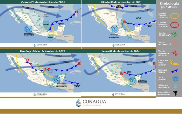 En el transcurso del domingo un nuevo frente frío ingresará al norte y noreste del territorio nacional, y el día lunes se desplazará sobre el golfo de México; por su parte, un canal de baja presión prevalecerá extendido sobre el occidente del golfo de México, por lo que se pronostican lluvias fuertes a puntuales muy fuertes, así como vientos con rachas fuertes en entidades del noreste, oriente y sureste del país, además de la península de Yucatán. Así mismo, continuará el ambiente frío a muy frío durante la mañana y noche con heladas al amanecer sobre el noroeste, norte, noreste, centro y oriente de la República Mexicana.