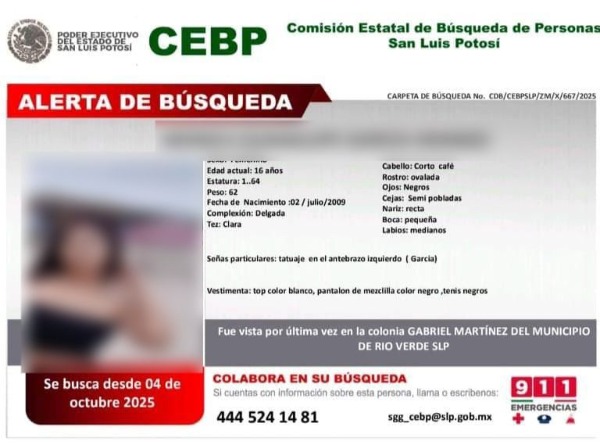 - Contaba con ficha de búsqueda del pasado 04 de octubre, tras ser vista por última vez, en la colonia Gabriel Martínez, perteneciente al municipio de Rioverde.
