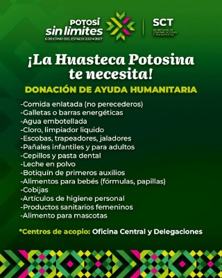 El Gobierno del Estado de San Luis Potosí, mantiene el apoyo a las comunidades afectadas por las intensas lluvias en la Huasteca. Dependencias como el Sistema Estatal para el Desarrollo Integral de la Familia (DIF), la Secretaría de Comunicaciones y Transportes (SCT), el Sistema Educativo Estatal Regular (SEER), entre otras, han habilitado centros de acopio para reunir víveres y artículos esenciales.