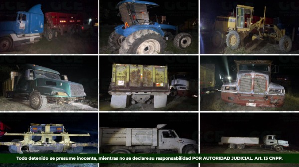Los vehículos asegurados son: un Volvo tipo volteo color amarillo con verde, un Kenworth color blanco, un Freightliner color blanco, un International tipo volteo color blanco, un Volvo tipo cisterna, un Freightliner color azul, un vehículo tipo góndola color rojo, un tractor agrícola New Holland color azul y una máquina tipo moto conformadora marca Caterpillar color amarillo.