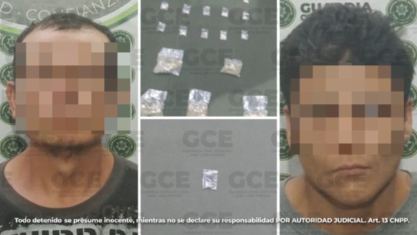 Efectivos de la GCE, desplegaron un operativo en coordinación con Ejército mexicano, en la colonia Las Mercedes, sitio donde resultaron detenidos Julio "N" de 44 años de edad y Juan "N" de 23 años, quien tiene antecedentes por probables delitos contra la salud. A los presuntos se les aseguraron 17 dosis de "cristal" y cinco bolsas con marihuana.
