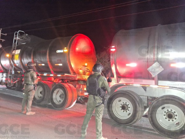 Así mismo, un vehículo Mitsubishi (desvalijado en estado de abandono), modelo 2017 con placas de Nuevo León, un vehículo GMC (desvalijado en estado de abandono), con placas de Nuevo León, dos remolques auto tanques cisterna, modelo 2023, con capacidad de 63 mil litros con reporte de robo del 01 abril del 2025, en carretera 80 km 32, comunidad El Mezquital, Villa de Arriaga. Una maquinaria motoniveladora, Caterpillar con reporte de robo y un Dolly en color gris.