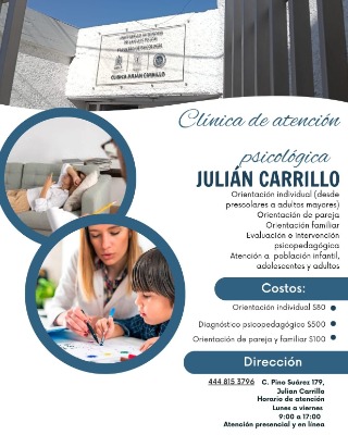 La Clínica de Atención Psicológica Julián Carrillo, adscrita a la Facultad de Psicología de la Universidad Autónoma de San Luis Potosí (UASLP), mantiene abiertos sus servicios a la población en general con costos accesibles y atención brindada por estudiantes de los últimos semestres, bajo supervisión profesional. Así lo dio a conocer la coordinadora del centro, la maestra Reyna Karina Medina Candelaria.