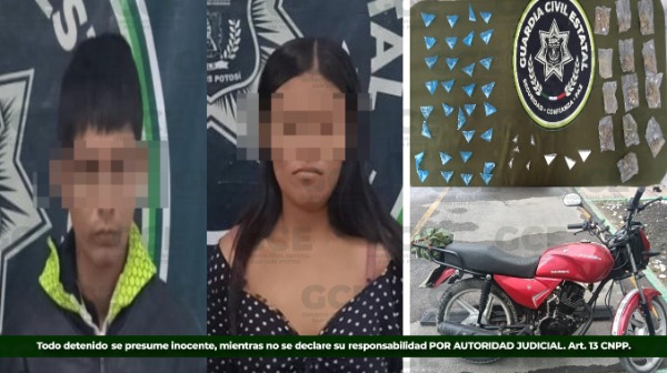 En el municipio de Ciudad Valles, se reportó el aseguramiento de un hombre y dos mujeres, luego de que nuestros agentes de la GCE desplegaran un operativo en el ejido San Felipe, luego de detectar a los presuntos, identificados como Eduardo "N" de 25 años, Marisol "N" de 19 años y una joven de 15 años, con 13 bolsas con marihuana, 33 dosis de metanfetaminas, tres de cocaína, cinco de "crack", así como 10 objetos metálicos utilizados para dañar neumáticos y una motocicleta marca Italika, en la que se desplazaban.