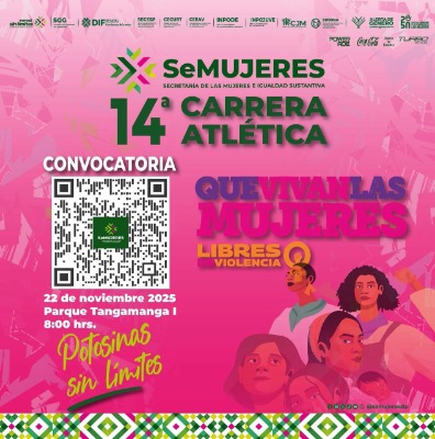 El sábado 22 de noviembre, en el parque Tangamanga I se realizará la XIV Carrera Atlética "Potosinas Sin Límites", organizada por la Secretaría de las Mujeres por el #25N, mientras que el mismo día, en el Auditorio Renovación del parque Tangamanga II se celebrará la TOMODACHI CUP 2025, con competencias de kata y kumite, reuniendo a practicantes y familias de artes marciales.