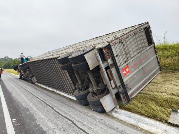 Un camión ganadero terminó volcado a un costado del libramiento Valles-Tamuín, luego de que su operador perdiera el control mientras avanzaba por la carretera de cuota.