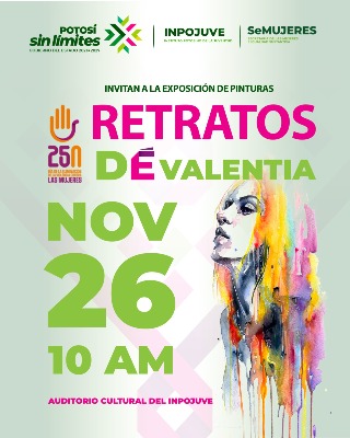 Además, para seguir promoviendo las políticas de cero tolerancias a la violencia contra las mujeres, de prevención y protección a las potosinas el 26 de noviembre a las 10:00 horas, se presentará la exposición pictórica "Retratos de valentía" de la artista Miriam Moreno Castillo en el auditorio cultural del Inpojuve.