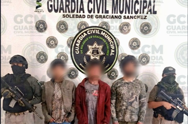 En una acción inmediata y efectiva, oficiales de la Guardia Civil de Soledad de Graciano Sánchez detuvieron a cuatro hombres señalados de presunta extorsión y portación de arma de fuego, luego de que habitantes del Ejido Soledad denunciaran amenazas y exigencia de pagos por sus terrenos.