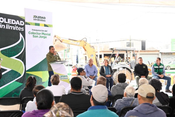 Juan Manuel Navarro Muñiz, Alcalde de Soledad de Graciano Sánchez, entregó, este jueves, la construcción del colector pluvial en la avenida Acceso Norte, en el fraccionamiento San Jorge, una zona que sufría cada temporada de lluvias por inundaciones, afectando a habitantes, comerciantes y automovilistas; con esta obra de infraestructura hidráulica, se acaba esa situación histórica y se añaden beneficios como mejor movilidad, seguridad y servicios básicos de calidad para casi 10 mil personas de manera directa e indirecta.
