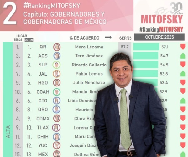 Octubre registró condiciones complicadas en varios estados debido a inundaciones, bloqueos carreteros, crisis políticas y episodios de violencia, factores que afectaron la percepción de los gobiernos locales. De los 32 gobernadores evaluados, 21 bajaron su aprobación respecto a septiembre. Aun así, Ricardo Gallardo logró sostenerse en el Top 3, solo por debajo de Mara Lezama (Quintana Roo) y Tere Jiménez (Aguascalientes).