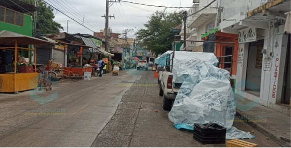 Además, se observó que los fruteros y bodegueros continúan apartando espacios con obstáculos y vehículos, sin cumplir con ninguna medida de higiene, lo que genera un ambiente sucio y desordenado alrededor de los mercados. Motos estacionadas en lugares indebidos y puestos abandonados en plena calle complican aún más el tránsito.