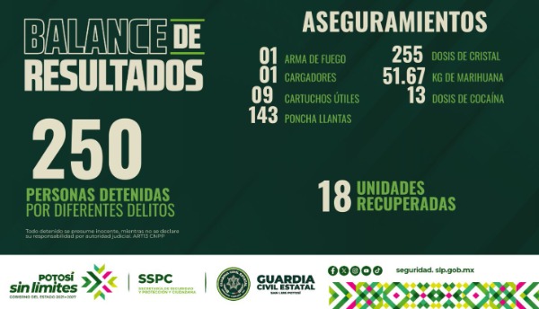 Dentro del Plan Integral de Seguridad, elementos estatales indicaron que detuvieron a 250 personas, en el periodo del 22 al 28 de noviembre del presente año. Además, ubicaron en distintos puntos 14 automotores y cuatro motocicletas, dando un total de 18 unidades, como parte de los trabajos de búsqueda de los uniformados.