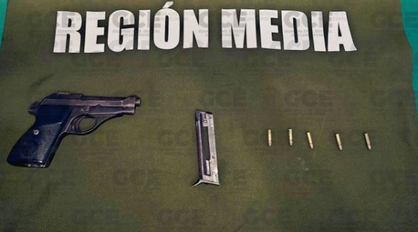 En una segunda acción durante recorridos de seguridad en la localidad de Cañada Grande, personal operativo detectó a un masculino que al ver la presencia de los elementos de seguridad intentó huir a bordo de una motocicleta, dándole alcance y asegurándole un arma de fuego corta calibre .22 abastecida, así como cinco cartuchos útiles.