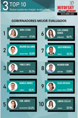 El Gobernador de San Luis Potosí, Ricardo Gallardo Cardona, se mantiene en los primeros lugares del ranking nacional de aceptación ciudadana elaborado por Consulta Mitosfky y en la evaluación del mes de noviembre subió su puntaje con respecto al mes anterior para colocarse en el segundo lugar con 55.8 puntos porcentuales.