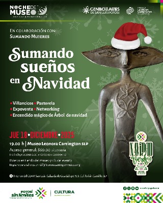 El museo Leonora Carrington será sede este 18 de diciembre a partir de las 19:00 horas de "Sumando sueños en Navidad", una edición especial de Noche de Museo que conjuga arte, convivencia y espíritu solidario, en coordinación con la Red Sumando Mujeres. La programación contempla música en vivo a cargo de la Banda Sinfónica de la Escuela Estatal de Música, así como un repertorio de villancicos interpretados por el Coro de la Escuela de Iniciación del Centro de las Artes de San Luis Potosí (Ceart), creando un ambiente festivo y accesible para todo público.