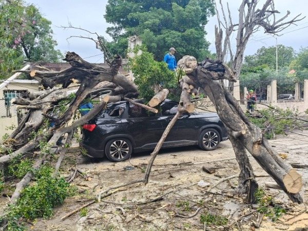 El incidente ocurrió en el patio de un domicilio ubicado en la calle Pedro J. Méndez, esquina con Bolivia, donde el árbol colapsó y derribó parte de una barda, además de dañar cableado de energía eléctrica y de telefonía.