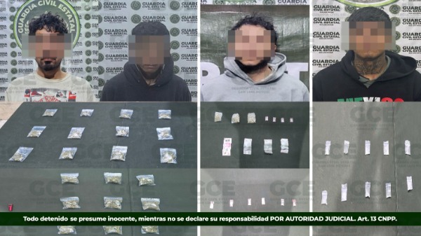 En la capital potosina, la GCE detuvo a Fernando "N" de 29 años y a Ricardo "N" de 26 años, luego de asegurarles 21 bolsas con marihuana, detectados como principales distribuidores de sustancias nocivas en el sector sur de la zona metropolitana. Ambos cuentan con antecedentes criminales por presuntos delitos contra la salud.