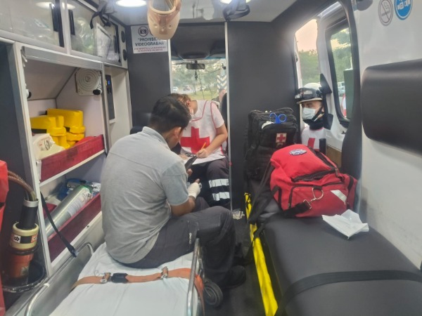 A consecuencia del choque, el motociclista salió proyectado contra el vehículo y se golpeó el rostro con el medallón, sufriendo lesiones leves. Paramédicos de la Cruz Roja acudieron al lugar para brindarle atención prehospitalaria y se indicó que sería trasladado a una clínica para su valoración médica.
