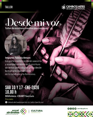 El Centro de las Artes de San Luis Potosí (CEART) invita a participar en el taller de escritura creativa para mujeres "Desde mi voz", un espacio dedicado a la exploración de la palabra desde la experiencia cotidiana y la diversidad de lo femenino. Esta actividad se realiza en el marco del impulso a la cultura y las artes que promueve el Gobernador del Estado, Ricardo Gallardo Cardona, a través de políticas que brindan apoyo sin límites a artistas y creadores, y fomentan el interés por la creación artística.