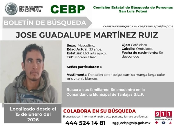 La Comisión Estatal de Búsqueda de Personas, en coordinación con elementos de la Policía Municipal, logró la localización del joven José Guadalupe Martínez Ruiz, quien había sido reportado como desaparecido y fue hallado deambulando en el municipio de Tanlajás.