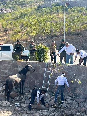 Durante las maniobras participaron la Coordinación Estatal de Protección Civil (CEPC) y la Guardia Civil Estatal (GCE), quienes actuaron con precisión y responsabilidad para liberar al equino y ponerlo a salvo, sin que se registraran riesgos mayores.